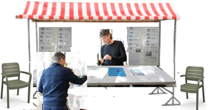 De buurtkraam is een plek waar je met je vraag over energie, isolatie en ventilatie terecht kan. Bij de koffiekar staan mensen klaar voor persoonlijke vragen. Die bespreek je (misschien) liever niet met je buren, dus staan ze klaar om de juiste persoon te vinden voor jouw probleem of vraag. Als je dat wilt, kunnen ze zorgen dat die persoon contact met je opneemt.