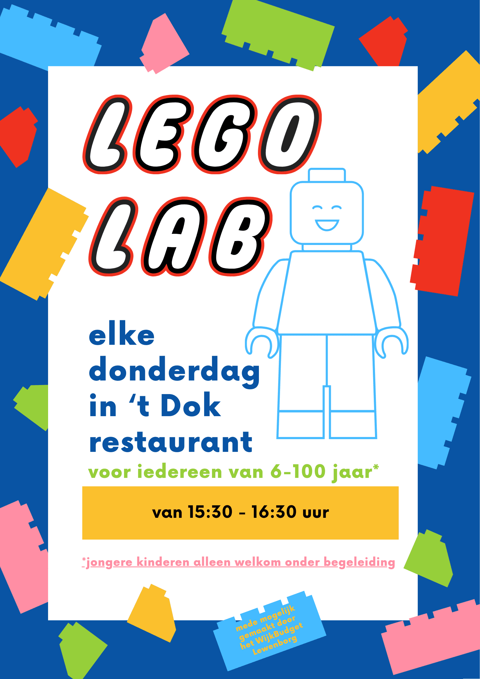 Wil je onbeperkt komen bouwen en spelen met LEGO? Dat kan tijdens de LEGO LAB middagen op donderdagmiddag in wijkcentrum Het Dok. Je kunt hier vrijblijvend komen spelen in het restaurant op de grote tafel aan de raamkant. Neem je beste vriend mee, en kom gezellig samen bouwen. Voor alle kinderen is er ook een gratis glaasje ranja.
