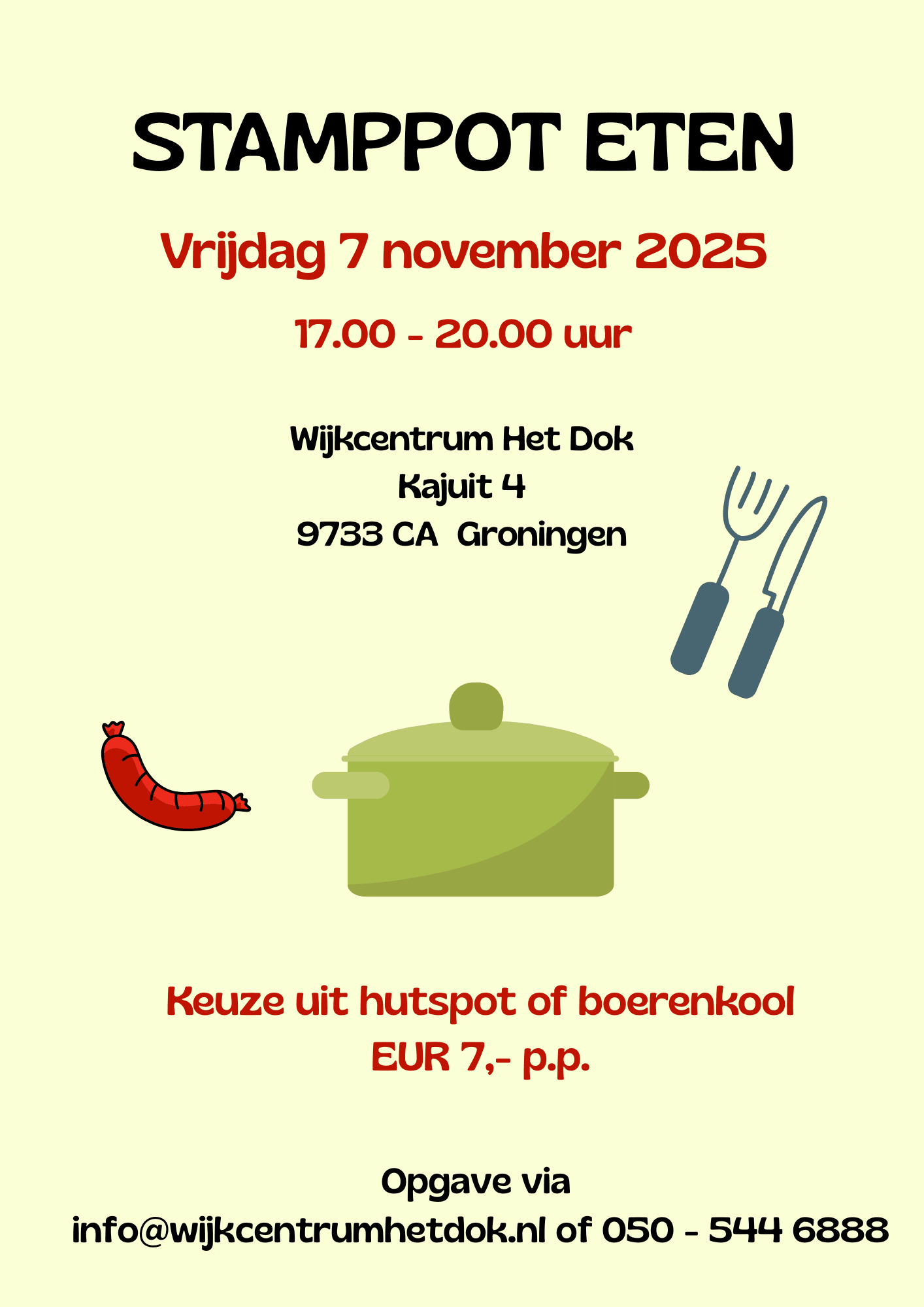 Lekker stamppot eten in het restaurant van Het Dok. Je kunt kiezen uit hutspot of stamppot boerenkool voor € 7,- pp. Opgeven kan via info@wijkcentrumhetdok.nl