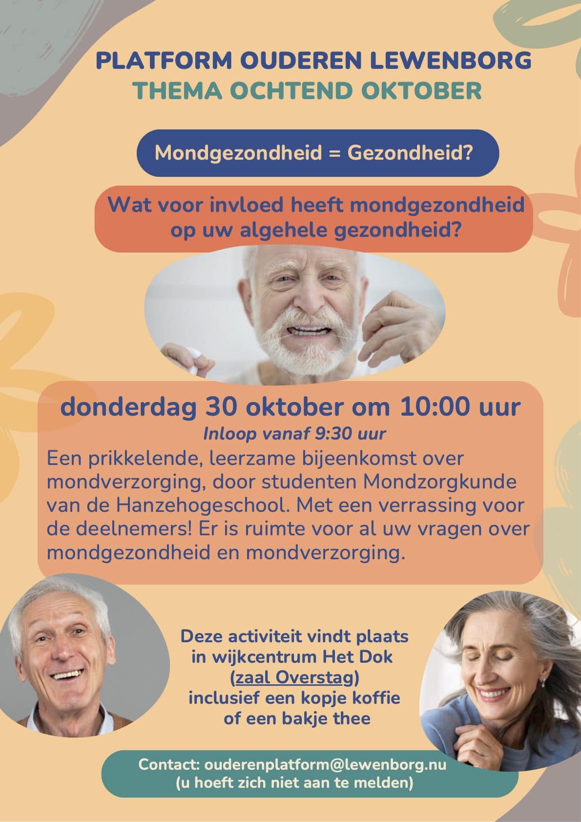Een prikkelende, leerzame bijeenkomst over mondverzorging, door studenten Mondzorgkunde van de Hanzehogeschool. Met een verrassing voor de deelnemers! Er is ruimte voor al uw vragen over mondgezondheid en mondverzorging.